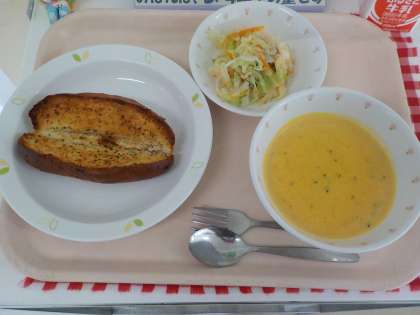 本日の給食は、ガーリックトースト・ツナサラダ・キャロットポタージュ・牛乳です。
