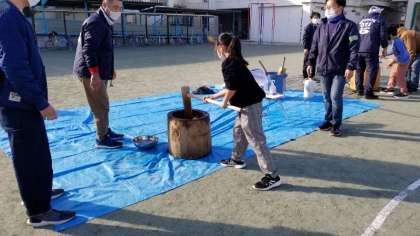 「よいしょ」の掛け声に合わせて、一人一人が餅つきを体験をしています。