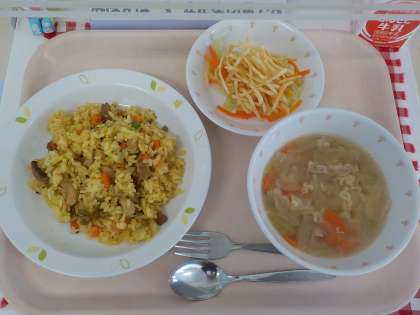 本日の給食は、カレーピラフ・じゃがいものハニーサラダ・ABCスープ・牛乳です。