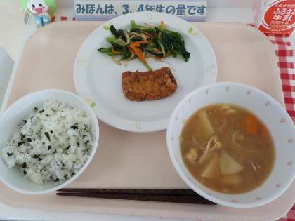 本日の給食は、わかめごはん・いかのかりんとあげ・おひたし・じゃがいもの味噌汁・牛乳です。