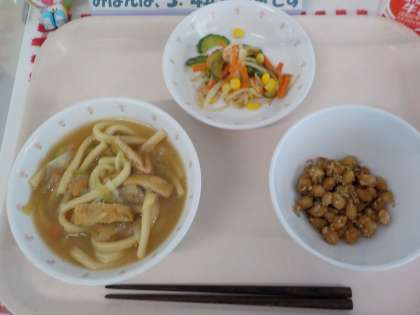 本日の給食は、きつねうどん・かみかみだいず・野菜のうめドレッシング・牛乳です。