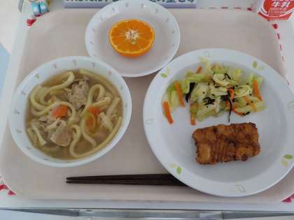 本日の給食は、にこみうどん・いかのさらさあげ・きゃべつの塩昆布かけ・みかん・牛乳です。