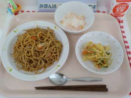 本日の給食は、ソース焼きそば・野菜の中華あえ・フルーツヨーグルト・牛乳です。