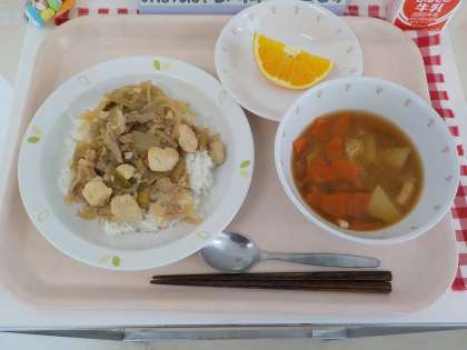 本日の給食は、豚丼・味噌汁・ネーブル・牛乳です。