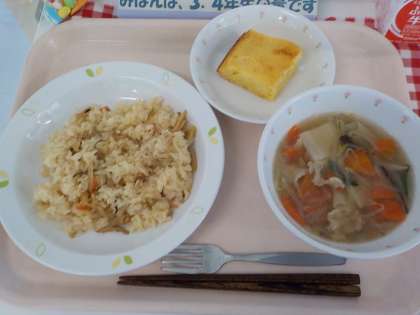 本日の給食は、中華おこわ・ワンタンスープ・オレンジマーマレードケーキ・牛乳です。