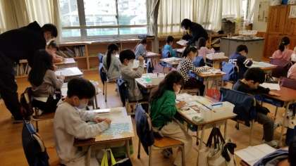 「楽しい学校せいかつ」の絵を描いています。