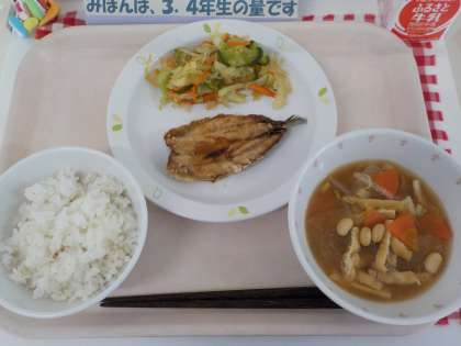 本日の給食は、麦ごはん・魚のかばやき風・糸寒天のあえ物・鬼よけ汁・牛乳です。