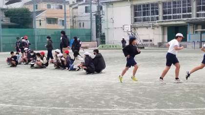 合同で体育を行っています。ペアをつくり、タブレットで、ラップタイムを記録しています。