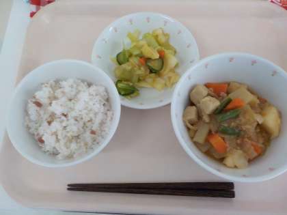 本日の給食は、梅じゃこごはん・じゃがいものそぼろ煮・野菜のしょうがじょうゆかけ・牛乳です。