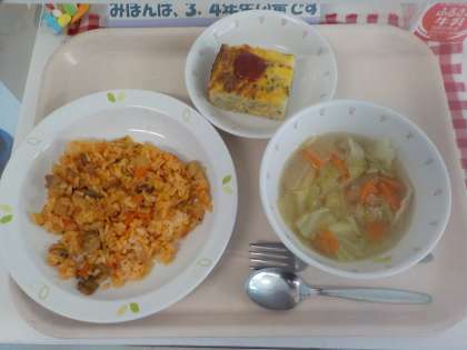 本日の給食は、チキンライス・オムレツ・野菜スープ・牛乳です。