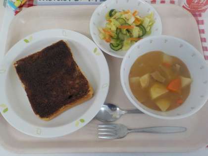 本日の給食は、ココアトースト・ポークシチュー・イタリアンサラダ・牛乳です。