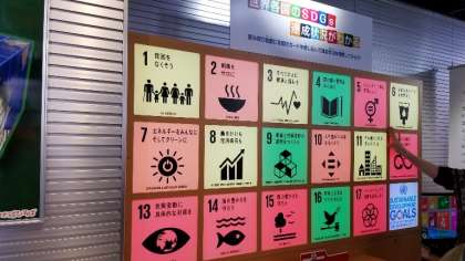 SDGsの日本の達成がわかるパネルです。緑色が、達成できた項目です。