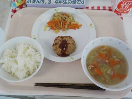 本日の給食は、ごはん・ハンバーグ・野菜ソテー・コンソメスープ・牛乳です。