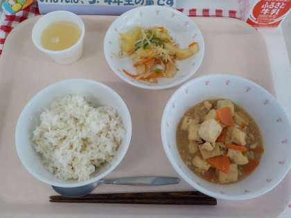 本日の給食は、麦ごはん・ジャージャン豆腐・白菜の中華サラダ・りんごゼリー・牛乳です。