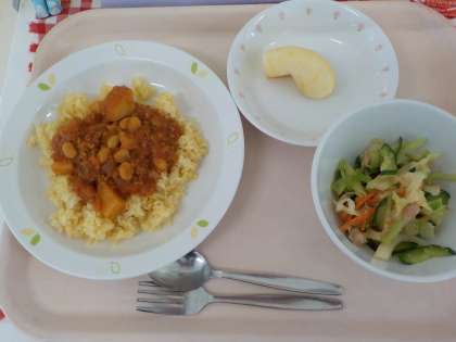 本日の給食は、チリビーンズライス・ツナサラダ・りんご・牛乳です。