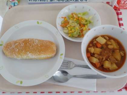 本日の給食は、揚げパン・ポークビーンズ・オニオンドレッシングサラダ・牛乳です。