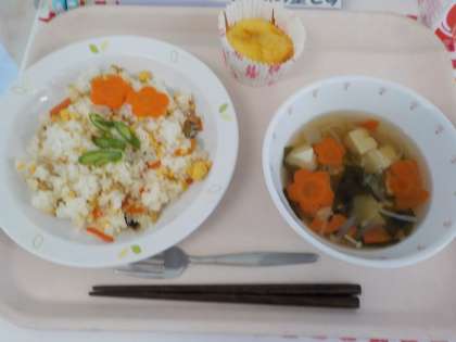 本日の給食は、ちらしずし・すまし汁・桃のヨーグルトケーキ・牛乳です。