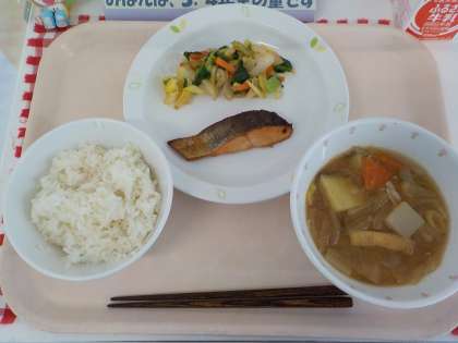 本日の給食は、麦ごはん・鮭の照り焼き・野菜のおかかあえ・豚汁・牛乳です。