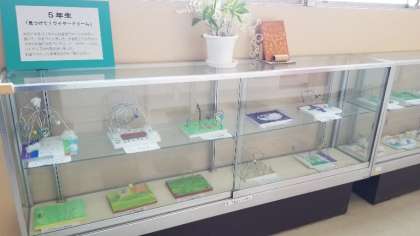 職員室前の廊下にあるガラスケースに、5年生の作品を展示しています。一人一人の個性がひかっています。