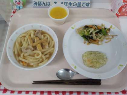 本日の給食は、にこみうどん・じゃがいもの天ぷら・小松菜のおひたし・みかんゼリー・牛乳です。