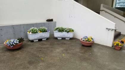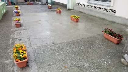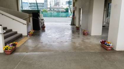わかば学級、2年生の育てたパンジーで、花道をつくりました。