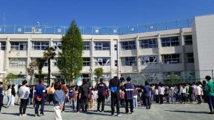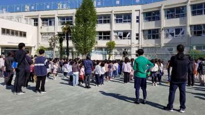 全校朝会に1年生が、参加しました。話の聞き方がとても上手です。天気もよく気持ちの良い1週間が始まりました。