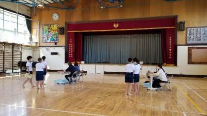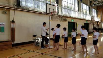 身長、体重、視力を計測しています。さすが高学年です。速やかな行動ができています。