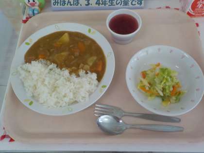 本日の給食は、カレーライス・コールスローサラダ・ぶどうゼリー・牛乳です。
