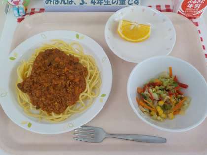 本日の給食は、スパゲッティミートソース・カラフルサラダ・甘夏・牛乳です。