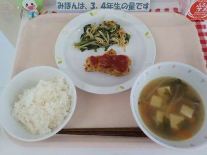 本日の給食は、ごはん・ヤムニョンチキン・もやしとにらのナムル・わかめスープ・牛乳です。