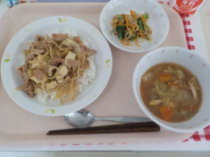 本日の給食は、豚丼・野菜のあえもの・きゃべつの味噌汁・牛乳です。