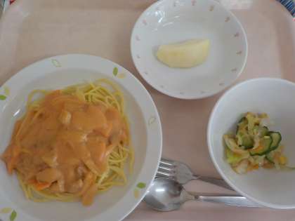本日の給食は、トマトクリームスパゲッティ・コーン入りサラダ・りんご・牛乳です。