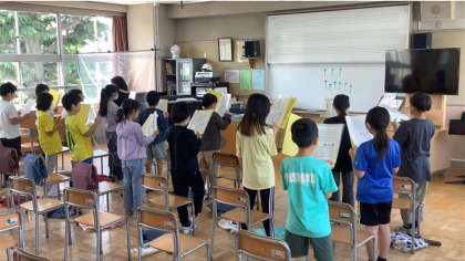 運動会に向けて、「ゴー ゴー ゴー」の歌を練習しています。赤組と白組の歌詞が美しく交わり、とても綺麗な歌声が音楽室に響いています
