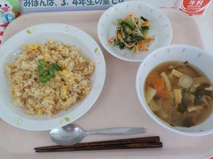 本日の給食は、そぼろごはん・ごまあえ・じゃがいもの味噌汁です。