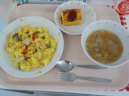 本日の給食は、パエリア・スペイン風オムレツ・野菜スープ・牛乳です。