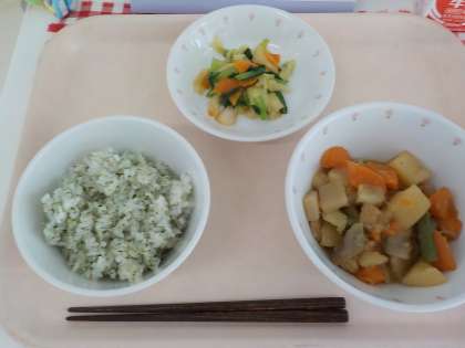 本日の給食は、かおりごはん・筑前煮・やさいのしょうがじょうゆがけ・牛乳です。