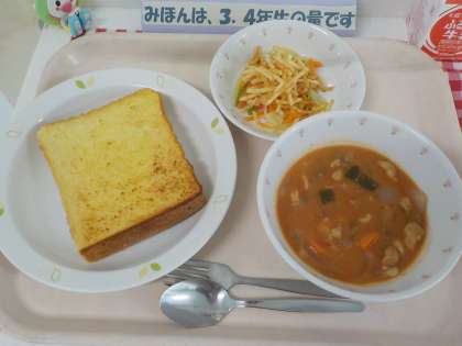本日の給食は、フレンチトースト・じゃがいものハニーサラダ・鶏肉のトマトソース煮・牛乳です。