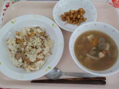 本日の給食は、豚肉とごぼうのごはん・だいずとじゃこの甘辛揚げ・けんちん汁・牛乳です。