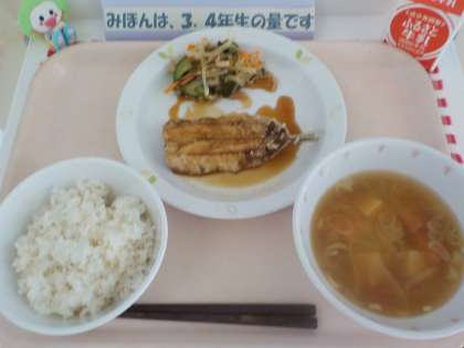 本日の給食は、ごはん・魚のかばやき風・和風サラダ・味噌汁・牛乳です。