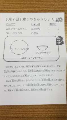 また、毎日、栄養士が給食の献立についてのプリントを作成しています。教室では、日直や係の子どもたちが読んでいます。