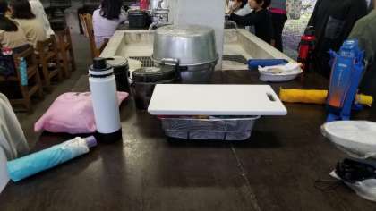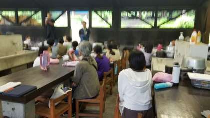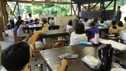 飯盒炊さんの説明を聞いています。行動班に別れて作業をします。一人一人担当が決まっています。