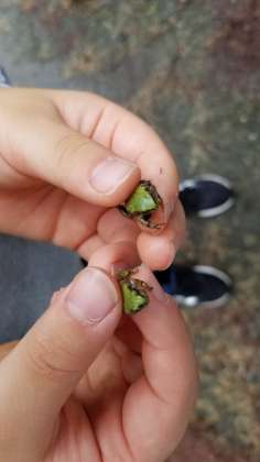カエルを見付けて、喜んでいます。