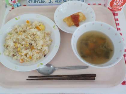 本日の給食は、チャーハン・いかのケチャップソースかけ・中華スープ・牛乳です。