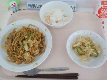 本日の給食は、カレー焼きそば・中華和え・フルーツヨーグルト・牛乳です。