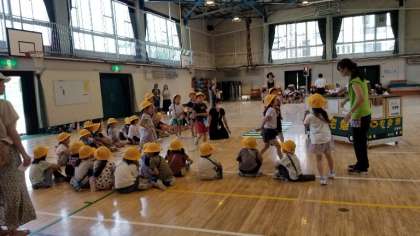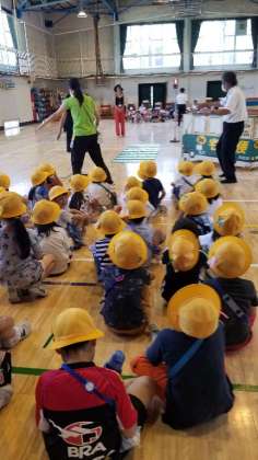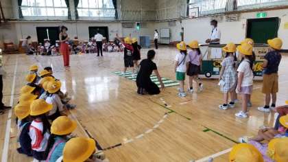 体育館にいどうして、標識の学習、横断歩道のわたり方の体験をしました。