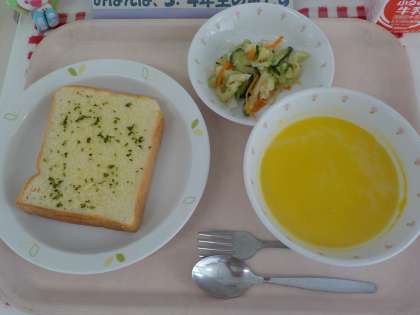 本日の給食は、ガーリックトースト・パンプキンポタージュ・たまねぎドレッシングサラダ・牛乳です。