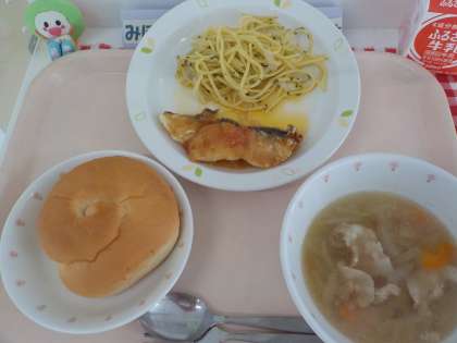 本日の給食は、ミルクパン・魚のラビゴットソース・スパゲッティバジリコ・野菜スープ・牛乳です。