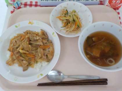 本日の給食は、スタミナ丼・さっぱりあえ・味噌汁・牛乳です。