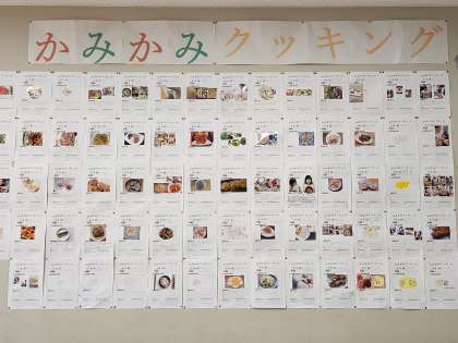 夏休みの自由参加の課題です。しっかり噛んで健康になりましょう。様々な工夫のあるお料理のレシピが並びました。