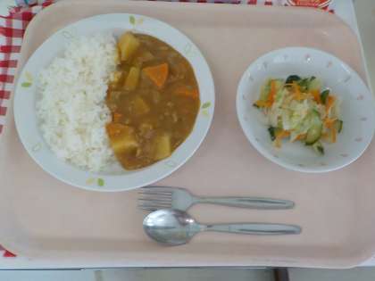 本日の給食は、カレーライス・フレンチサラダ・牛乳です。